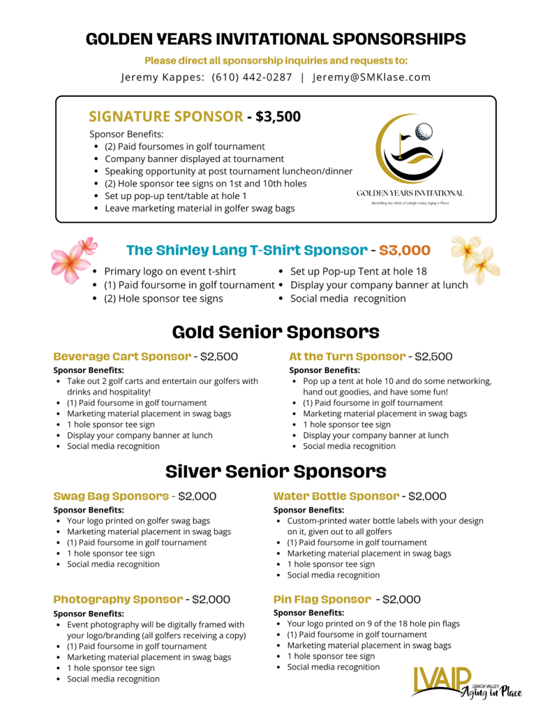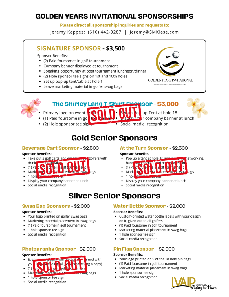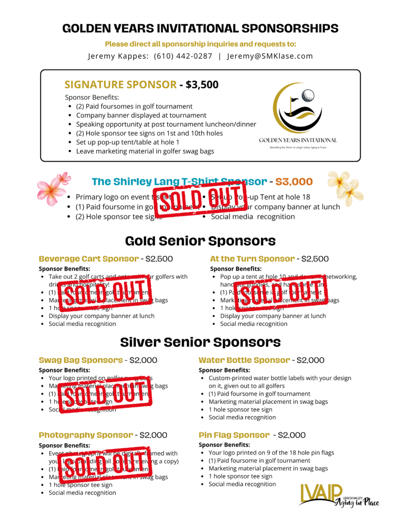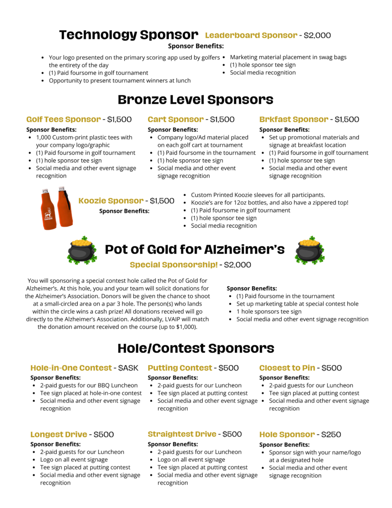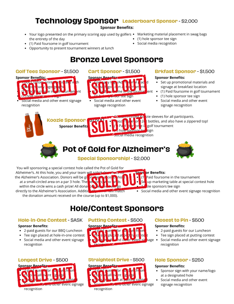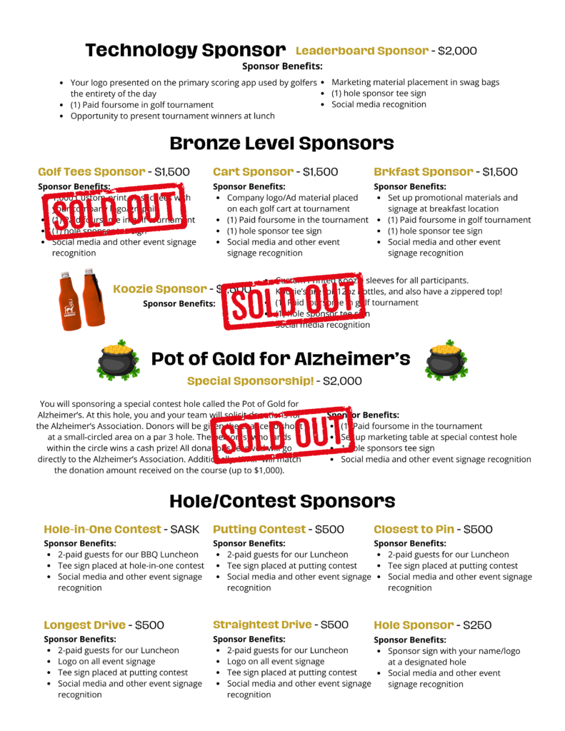 Event sponsorships are the fuel behind every successful golf tournament. We have created a variety of fun and beneficial sponsorships for you to choose from this year. If you have any questions regarding any of these sponsorships, please contact Jeremy Kappes at: